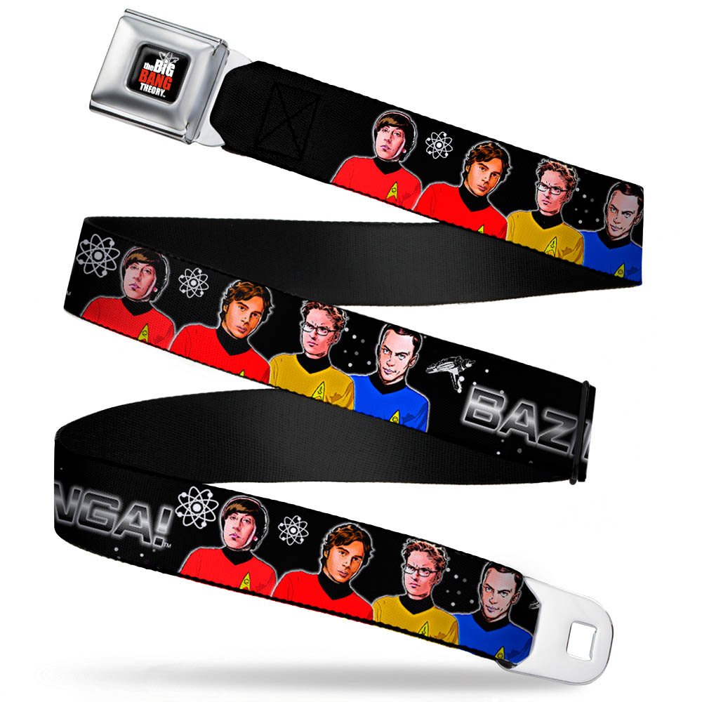 Blending two different genres together, this adjustable belt features the likenesses of the Big Bang Theory cast dressed in vintage Star Trek uniforms with an old school seat belt connector.